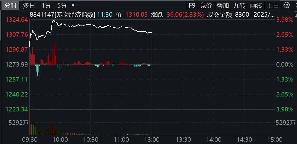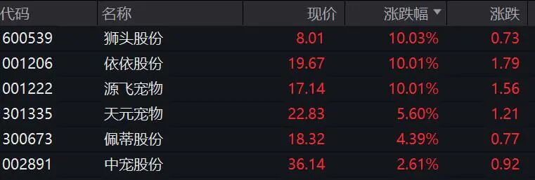 宠物经济意见延续昨日强势,赓续高开高走,板块指数放量涨近2%。依依股份、狮头股份、源飞宠物等涨停,此外乖宝宠物股价创历史新高,中宠股份创3年半新高。
