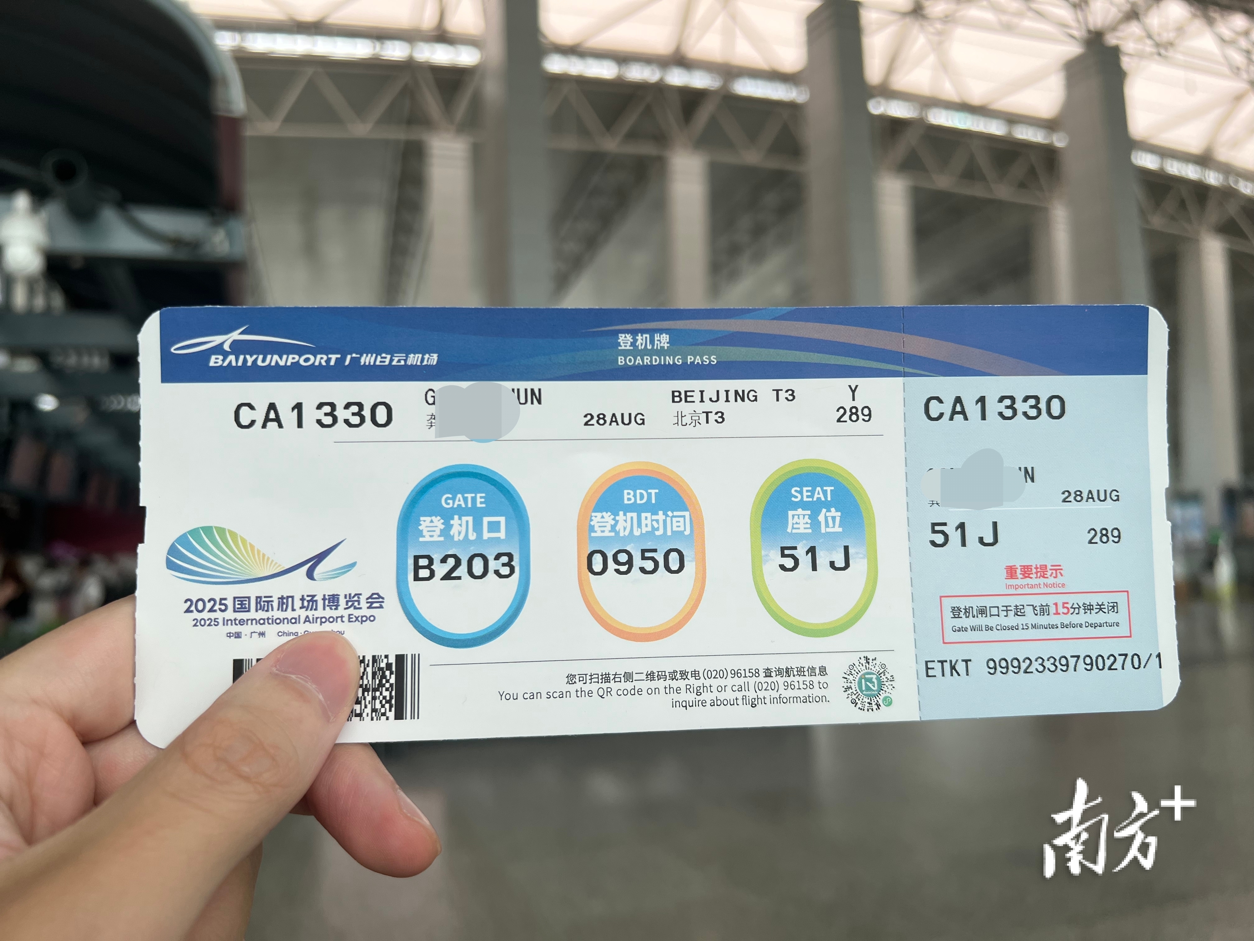 白云机场新版登机牌全新亮相,加多了三色舷窗和机场展览会会标。 杨韵供图