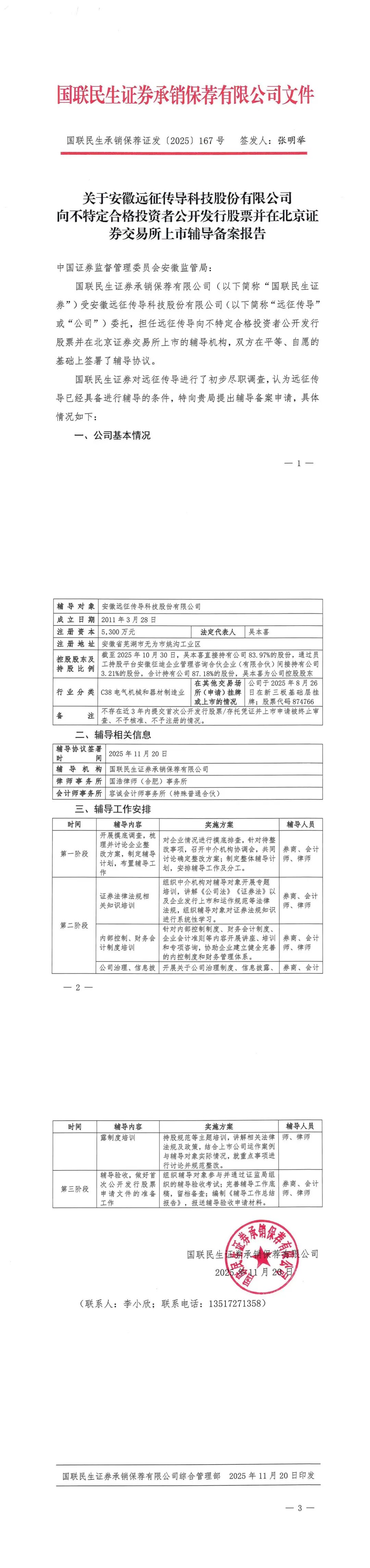 ]article_adlist-->2025年11月26日,证监会官网暴露,国联民生证券已提交《对于安徽远征传导科技股份有限公司向不特定及格投资者公开刊行股票并在北京证券交往所上市指令备案敷陈》,题名日历为11月20日。现在,远征传导的指令情状为“指令备案”。指令机构为国联民生证券承销保荐有限公司,讼师事务所为国浩讼师(合肥)事务所,管帐师事务所为容诚管帐师事务所(独特平素合资)。